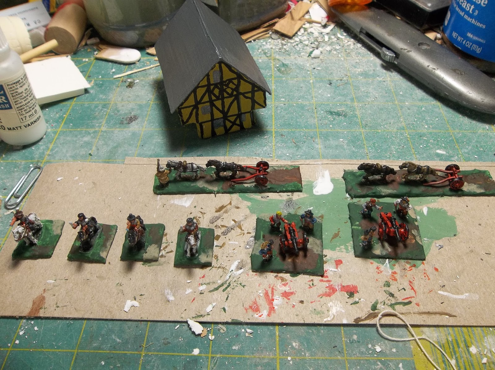 Behind them is a work in progress house, the first in a batch of 17th century buildings I plan to make. I used two layers of 1/2 inch foamcore, one wider at the top to get the jettied effect of the period, and clad them in thin card. The paintwork was done with basic craft acrylics, and the timberwork was done with a Sharpie marker pen. It's so much easier and less fiddly than using a brush. I've yet to add brickwork chimneys, doors, and crosshatch leading on the windows. First, I'll go make a cup of tea...