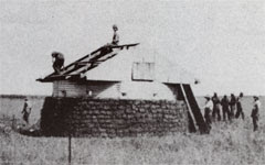 I use the mini-dowels available from Michael's hobby stores for the stakes, and popsicle sticks from the same source for the bases. Two packs of dowels should be sufficient to enclose five of the huts I made earlier. The crossbars are bamboo kabob skewers split lengthwise.